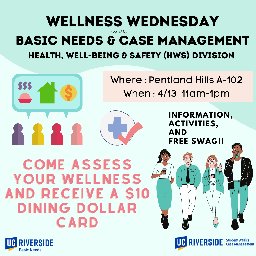 Please join the department of Basic Needs and Case Management for Wellness Wednesday on April 13, 2022 from 11am-1pm in Pentland Hills A-102.
