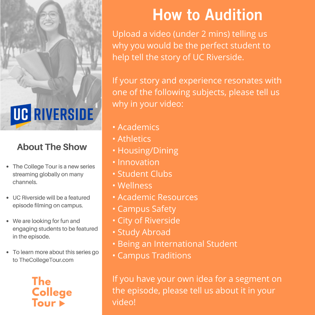 The College Tour, a show from Amazon Prime is visiting UCR this summer. We're beyond excited about this and we're hoping you may be interested to 'audition' to be a part of it (who wouldn't want to be on TV right?).