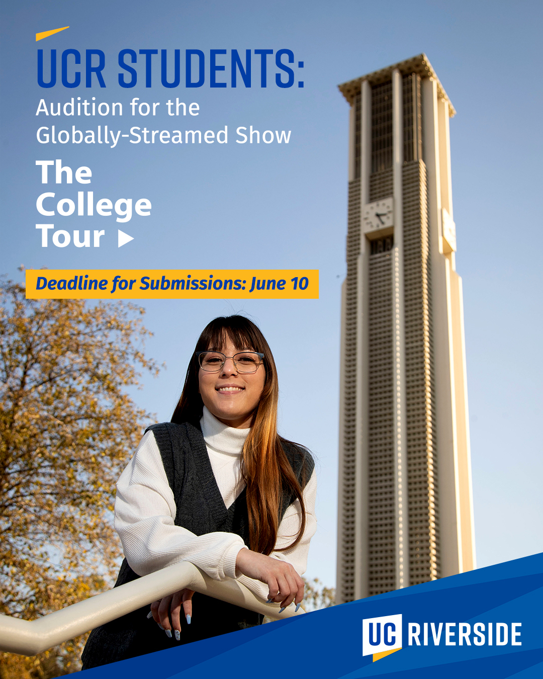 Caption: NOW CASTING! #UCR will be featured on an episode of the globally-streamed series @thecollegetourtv - so cool! They're filming on campus & looking for students who want to share their experiences. Just record a <2 min video telling us why you would be the perfect student to help tell the story of #UCRiverside. Deadline for video submissions: June 10. Get all the details - link in bio! Link to https://forms.gle/fHj549urSGhwcdD86