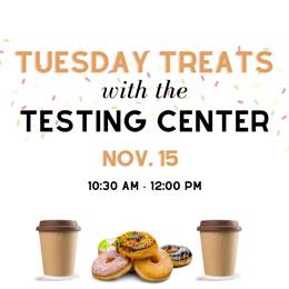 [Tuesday Treats with the Testing Center 11/15 10:30 AM-12PM Center/Bottom are two cups of coffee and a picture of donuts]