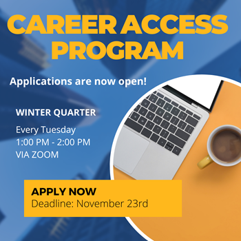 Career Access will take place Tuesday's during winter quarter from 1 PM to 2 PM on Zoom.
