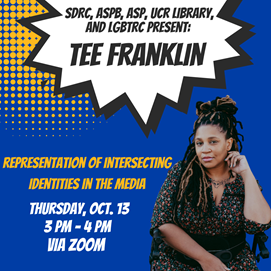 [Instagram Flyer in Comic theme. Center text is in an action like bubble. Text states: SDRC, ASPB, ASP, UCR Library, and LGBTRC present Tee Franklin. Tee Franklin's picture on the bottom right. Tee is sitting in their mobility chair. Text to the left states: Representation of Intersection Identities in the Media. Thursday, Oct 13th; 3pm-4pm via zoom.]