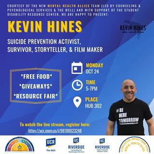The New Mental Health Allies Team (led by Counseling & Psychological Services & The Well) and support of the Student Disability Resource Center are excited to bring Kevin Hines to campus!