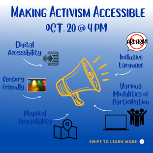 [Blue ombre background with text centered stating: Making Activism Accessible: Oct 20th at 4pm Various icons with text that states: Digital Accessibility, Inclusive Language, Sensory Friendly, Various modalities of participation, physical accessibility.]