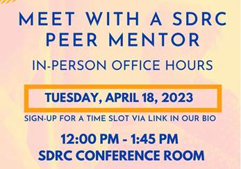[Meet with a SDRC Peer Mentor In-Person Office Hours Tuesday, April 18th 2023 12pm- 1:45 pm]