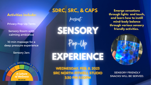 [marketing flyer for sensory pop-up event with background photo of fitwell studio, text states SDRC, SRC, and CAPS present sensory pop-up experience with details about activities]