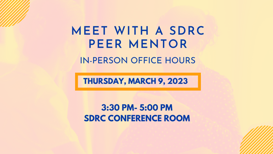 [Meet with a SDRC Peer Mentor In-Person Office Hours Thursday, March 9, 2023 3:30 PM- 5PM SDRC Conference Room]