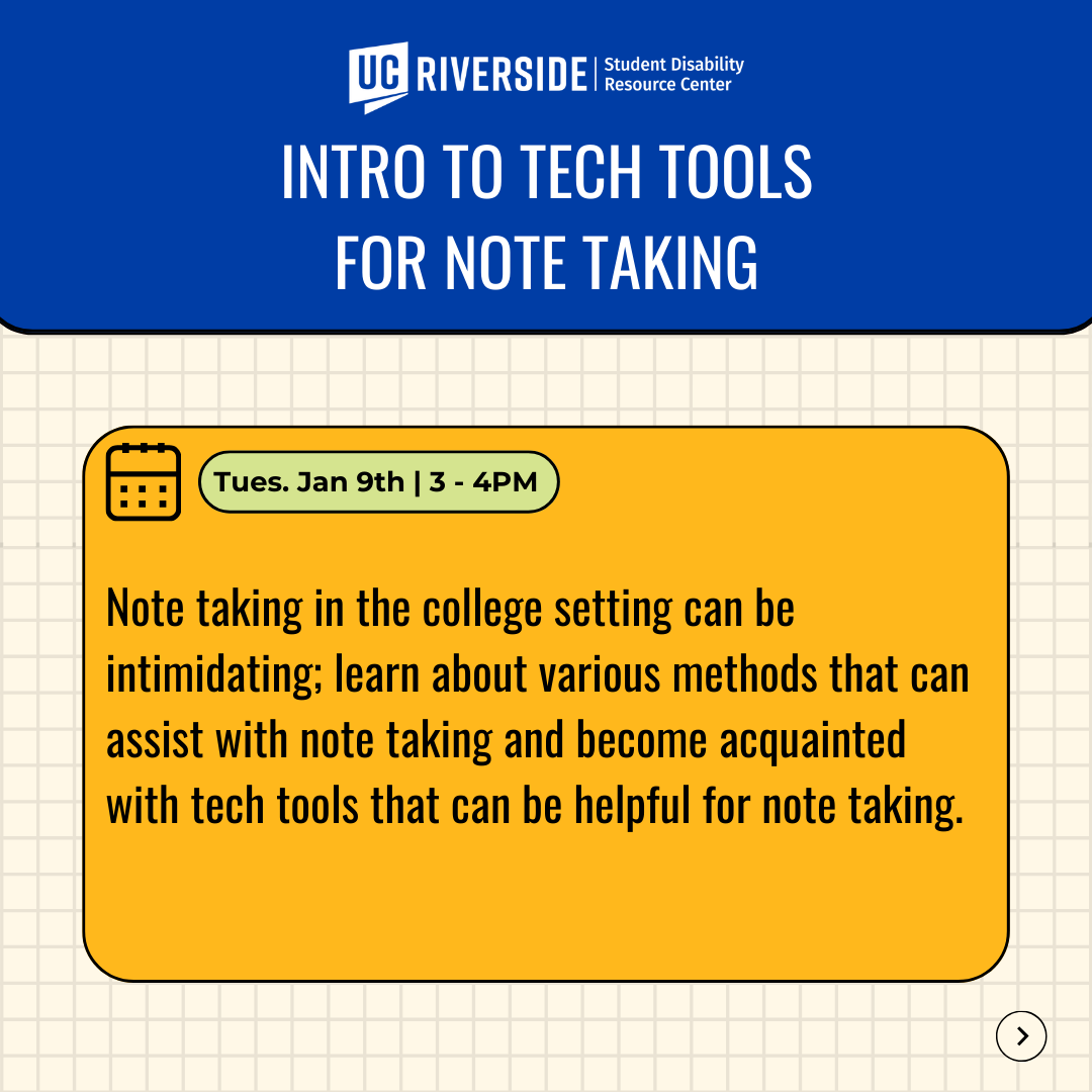 Note-taking in the college setting can be intimidating; come learn about various methods that can assist with note taking and become acquainted with tech tools that can be helpful for note taking!