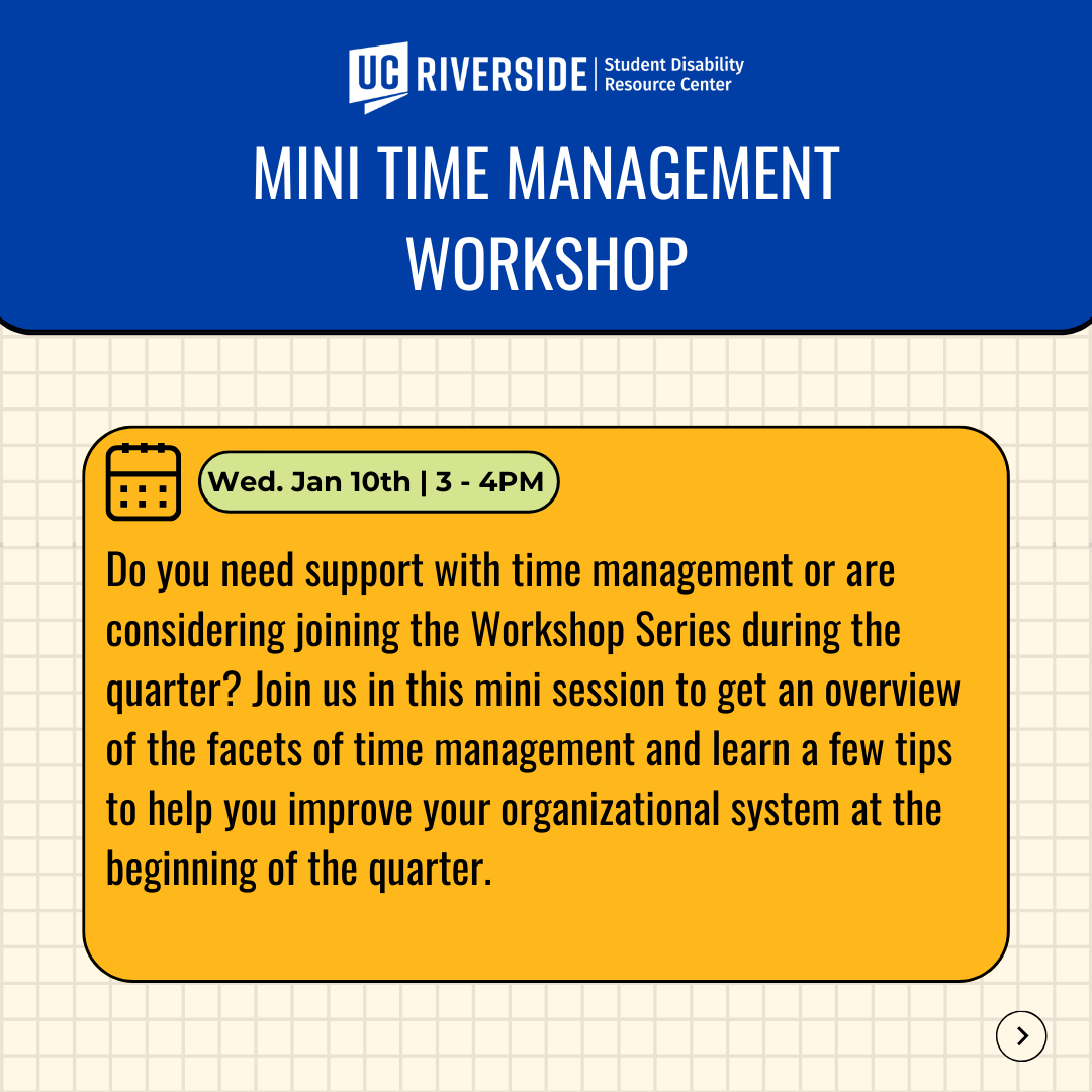 Do you need support with time management or are considering joining the Workshop Series during the quarter? Join us in this mini session to get an overview of the facets of time management and learn a few tips to help you improve your organizational system at the beginning of the quarter!