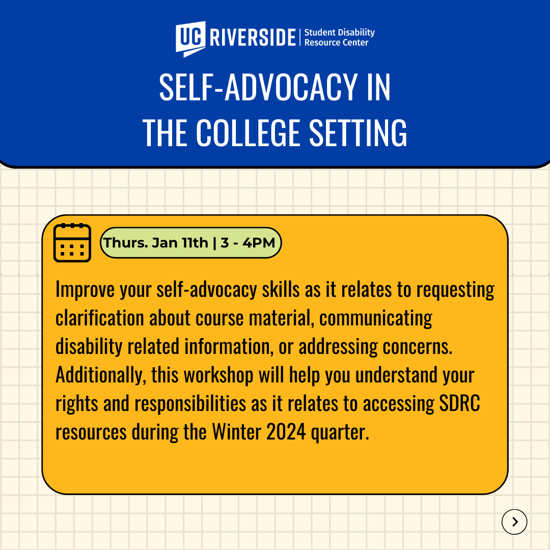 Additionally, this workshop will help you understand your rights and responsibilities as it relates to accessing SDRC resources during the Winter 2024 quarter.