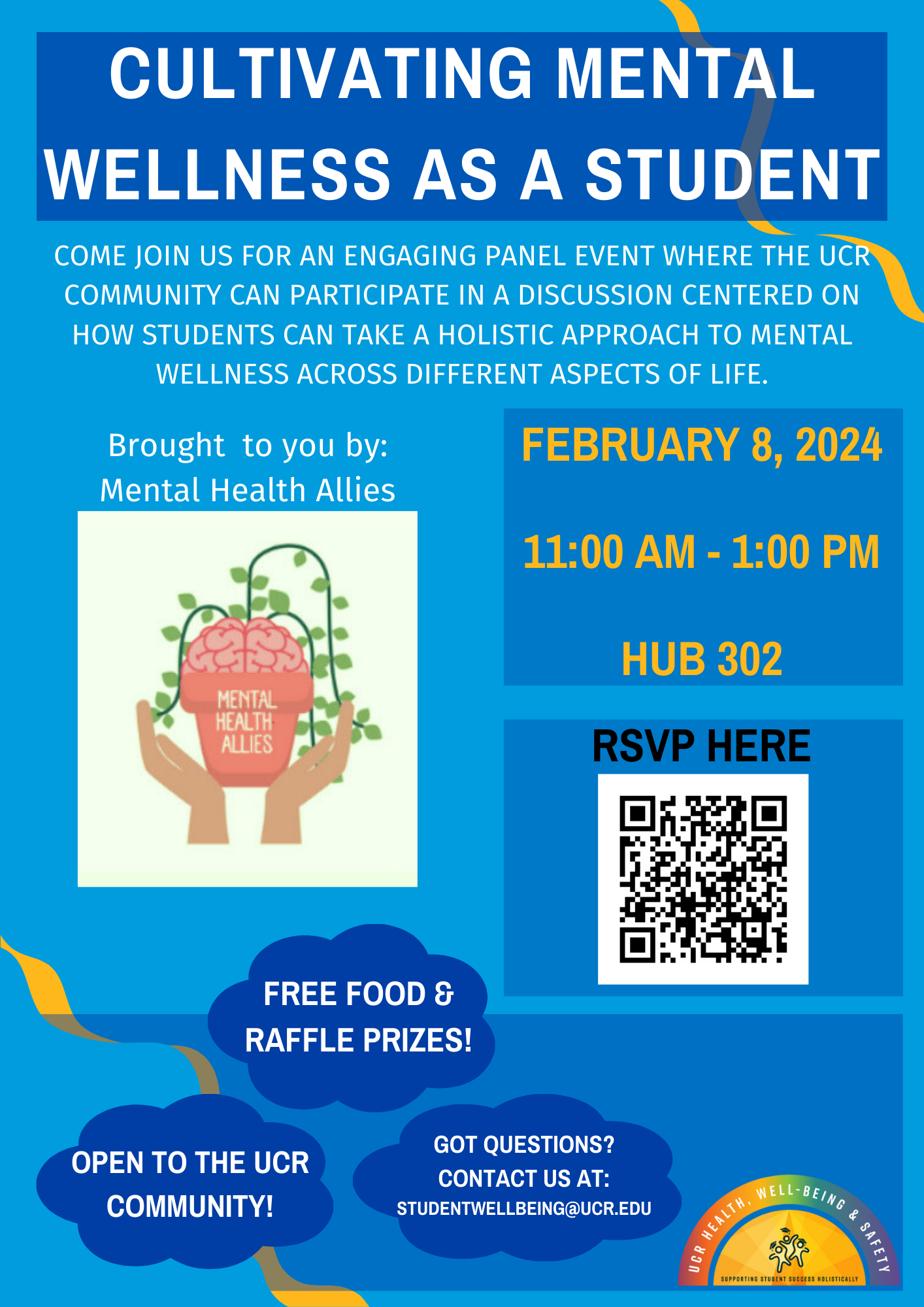 The Mental Health Allies are excited to invite you to their upcoming event, "Cultivating Mental Wellness as a Student," featuring a distinguished panel of speakers (flyer attached). This event will take place on Thursday, February 8th, from 11am-1pm at HUB 302 and promises to be an insightful discussion on the importance of mental health in the student community.