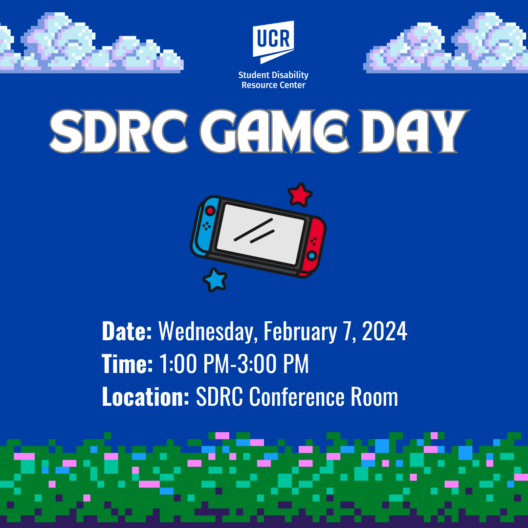 Greetings from the UCR Student Disability Resource Center and the UCR SDRC Snapshot. The UCR SDRC Snapshot is a periodic newsletter featuring reminders, resources, events, and opportunities from the Student Disability Resource Center.