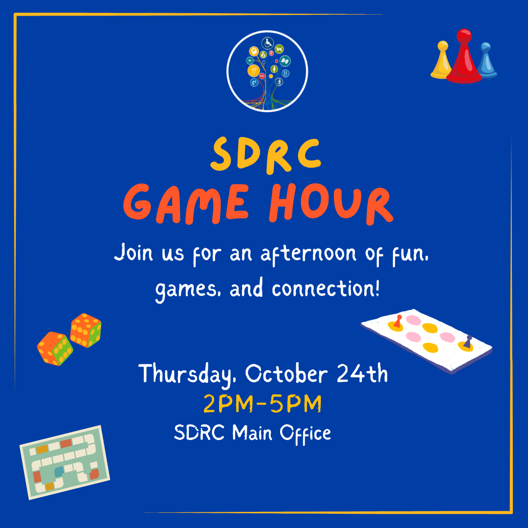 [SDRC Game Hour Flyer Join us for an afternoon of fun, games, and connection. Thursday, October 24th 2PM-5PM at SDRC Main Office]