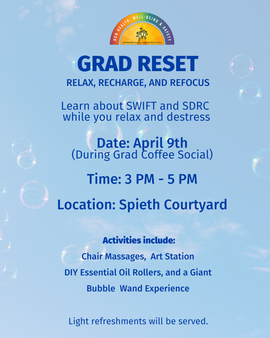Graduate students, join us at next week's Grad Success Coffee Social where you will get a chance to learn about SWIFT and SDRC while you relax and destress! Activities include chair massages, DIY essential oil rollers, giant and a bubble wand experience. Light refreshments will be served.