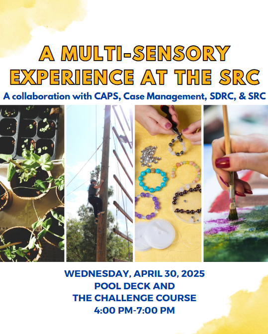 [Flyer for a multi-sensory experience at the SRC: A collaboration with CAPS, Case Management, SDRC, and SRC. Wednesday April 30,m 2025, pool deck and the challenge course 4PM- 7PM]