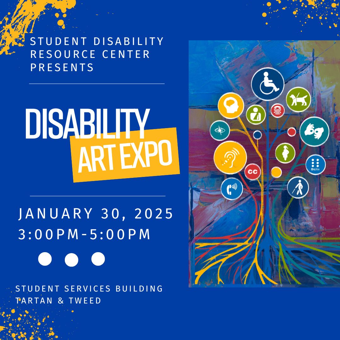 [STUDENT DISABILITY RESOURCE CENTER PRESENTS DISABILITY ART EXPO JANUARY 30, 2025 3:00-5:00 PM STUDENT SERVICES BUILDING TARTAN & TWEED]