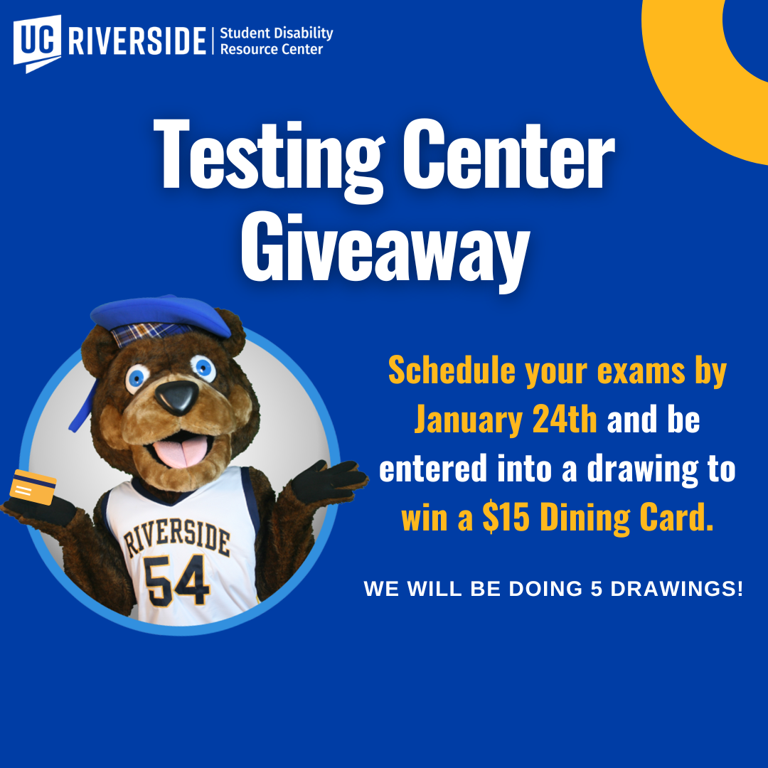 Please schedule your exams 10 days prior to the test date and 2 weeks prior to your finals via R’Ability<https://rability.ucr.edu/clockwork/custom/misc/index>. If you miss the cutoff, you may submit a late exam request and the requests are processed based on availability of resources. Late exam requests are not guaranteed.