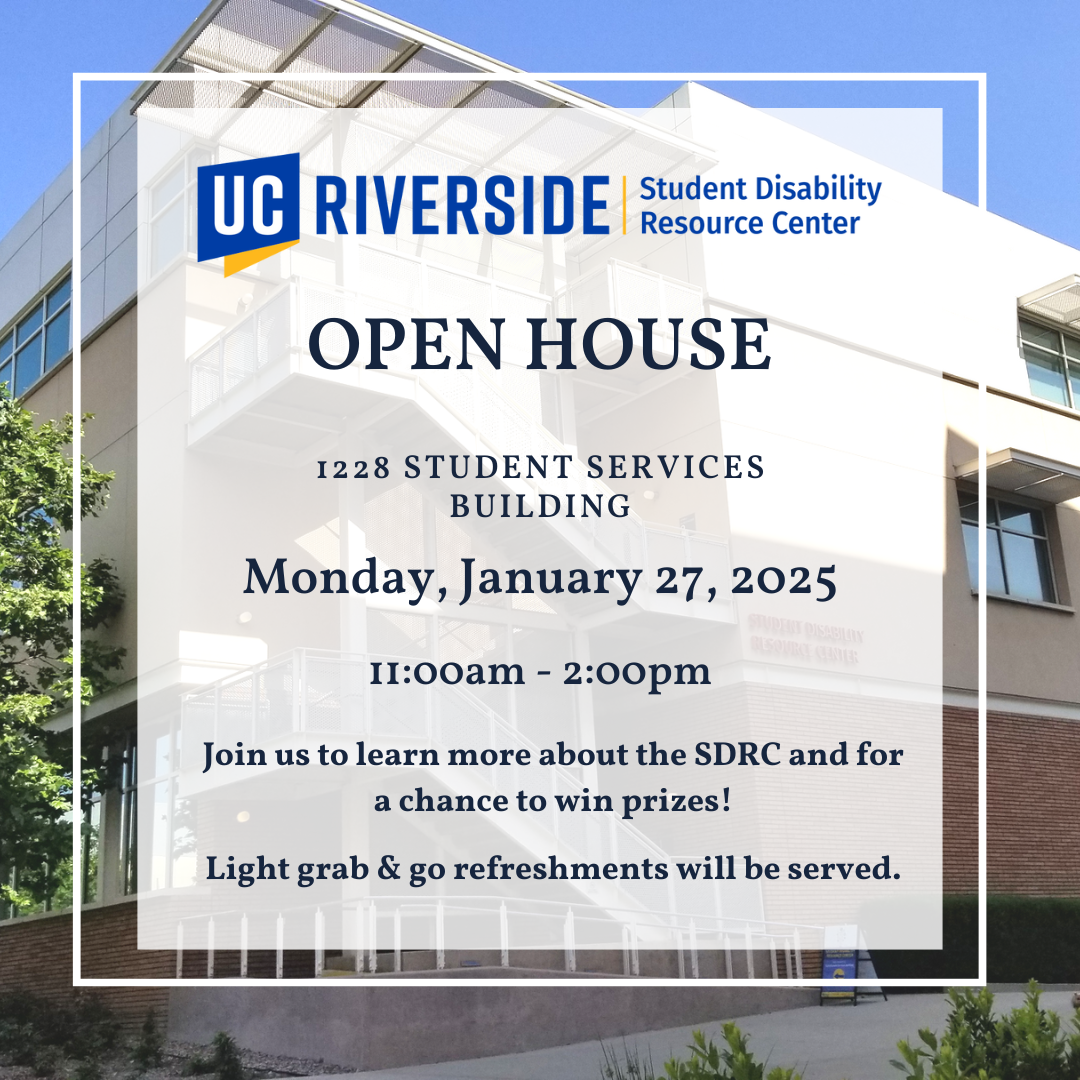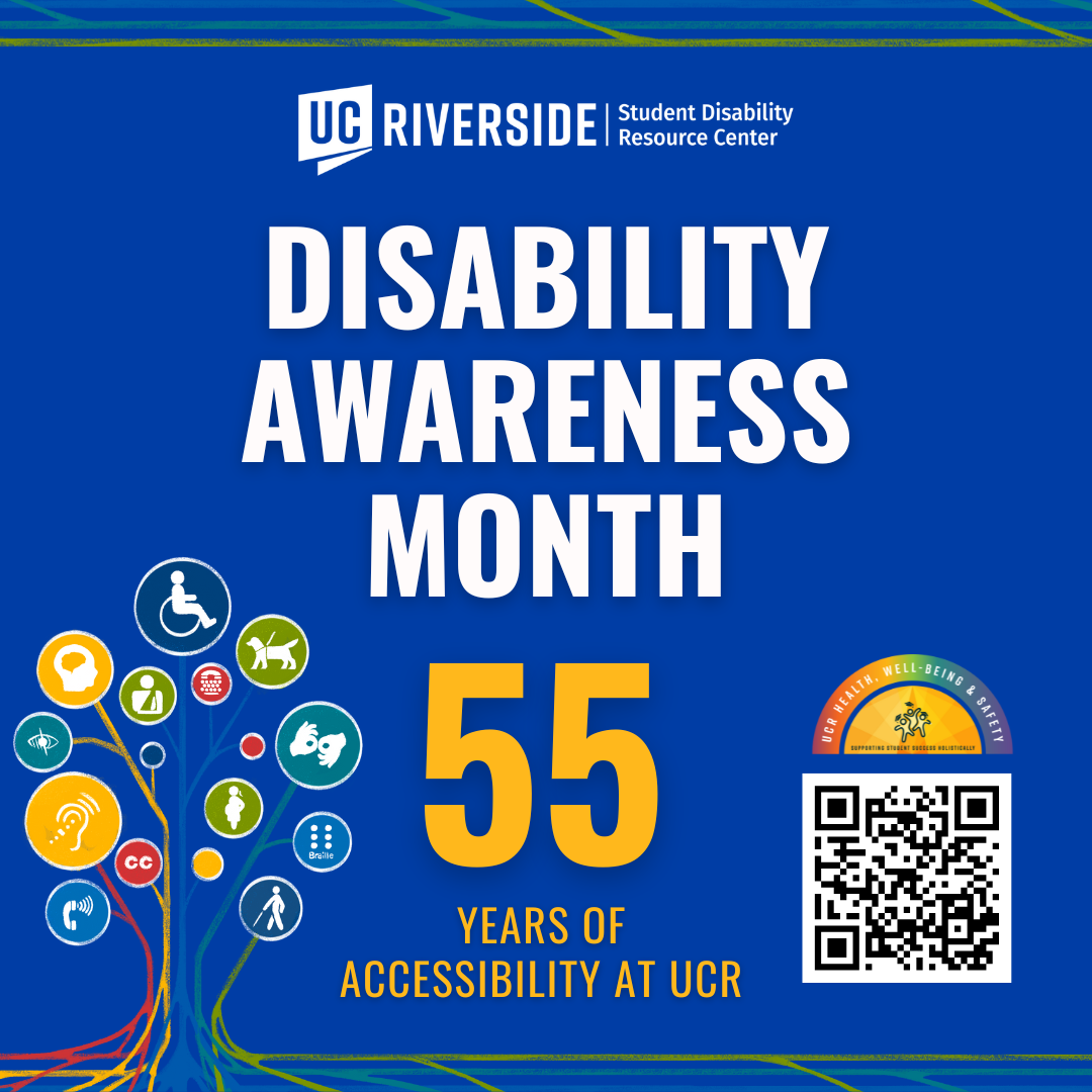 This year, SDRC has designated January 2025 to be our Disability Awareness Month. We are excited to work with campus and community partners to raise awareness, promote inclusivity, build community ,and celebrate diversity. We are also celebrating 55 years of accessibility at UC Riverside. Stay tuned because we’ve got some exciting events and initiatives coming your way. More information about can be found on sdrc.ucr.edu/events .