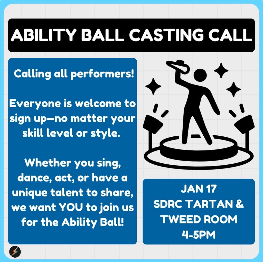 [Flyer for student disability Union meeting. An open casting call for the ability ball. The meeting will take place from 4 PM to 5 PM January 17 in the Tartan and Tweed room.]