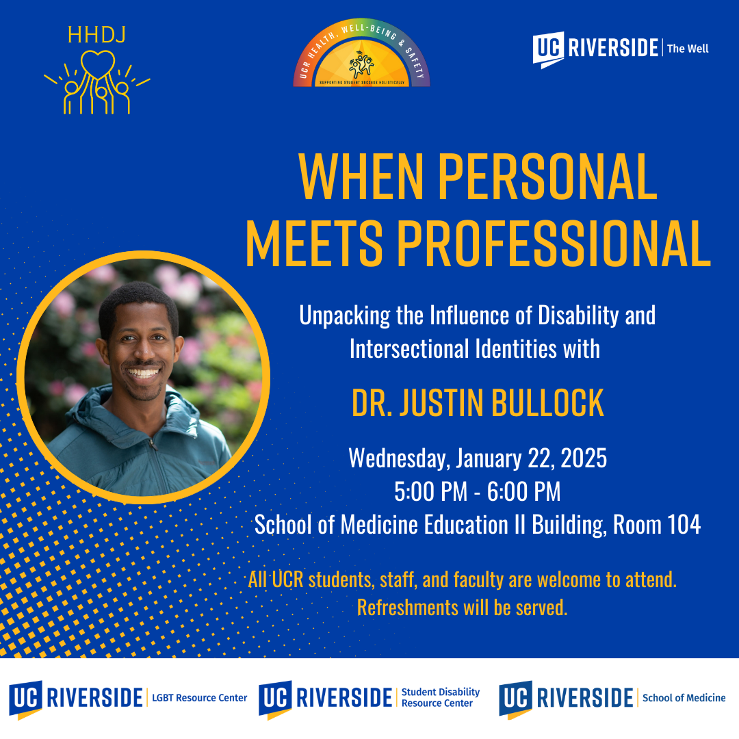 TODAY, we are hosting UCR Disability Awareness Month<https://sdrc.ucr.edu/events> featured speaker, Dr. Justin Bullock. Here is a link to more information about this event<https://events.ucr.edu/event/disability-awareness-month-feature-speaker-event-when-personal-meets-professional-unpacking-the-influence-of-disability-and-intersectional-identities?utm_campaign=widget&utm_medium=widget&utm_source=UC+Riverside&_gl=1*clcsqn*_ga*MzIwMDQwODE2LjE3MzQ3NDAwOTc.*_ga_S8BZQKWST2*MTczNzU2Nzc5OS4zMS4xLjE3Mzc1Njg1NzEuMC4wLjA.*_ga_Z1RGSBHBF7*MTczNzU2Nzc5OS4yOC4xLjE3Mzc1Njg1NzEuMC4wLjA.>.