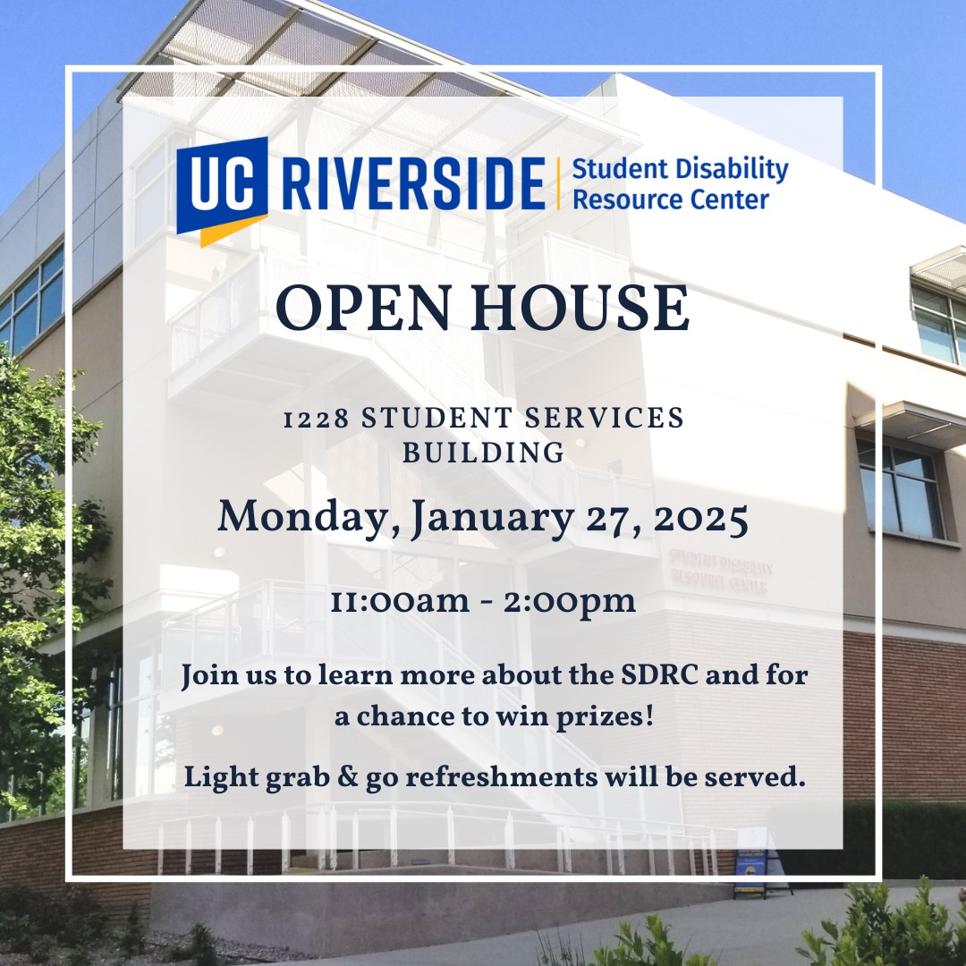 [Flyer for Student Disability Resource Center Open House. Monday, January 27, 2025 11 AM to 1 PM. 1228 student services building. Join us to learn more about SDRC and for a chance to win prizes. Light grab and go refreshments will be served!]