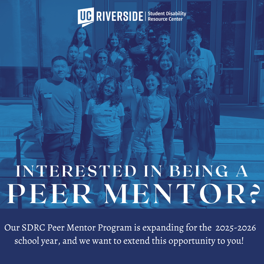 [A group of diverse students stands together smiling in front of a building at UC Riverside. The image has a blue overlay and features the UC Riverside Student Disability Resource Center logo at the top. Large text in the center reads, "Interested in being a Peer Mentor?" Below, smaller text says, "Our SDRC Peer Mentor Program is expanding for the 2025-2026 school year, and we want to extend this opportunity to you!"]