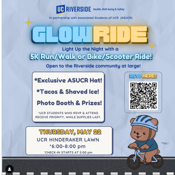 [UCR Glow Ride is a vibrant nighttime event at UC Riverside, happening on Thursday, May 22nd from 6-8pm, bringing the Riverside community together for an illuminated bike ride, run, or walk around campus. Decorate yourself and your bike with glow gear, enjoy music, and promote wellness and sustainability. Don't miss this glowing adventure! Open to Riverside community at large. Please note that food is limited and will be prioritized to those on the RSVP list; while supplies last. First 120 UCR students who RSVP and attend the event will receive an exclusive ASUCR hat. An RSVP form must be submitted for each participant.]