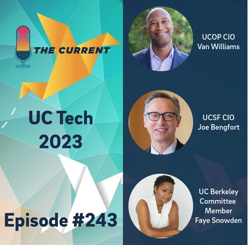 [The Current: UC Tech 2023. Episode #243. UCOP CIO Van Williams (photo), UCSF CIO Joe Bengfort (photo), UC Berkeley Committee Member Faye Snowden (photo)]