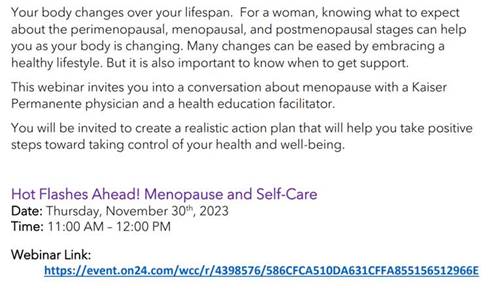Reminder! Tomorrow is the Kaiser Permanente Hot Flashes Ahead! Menopause and