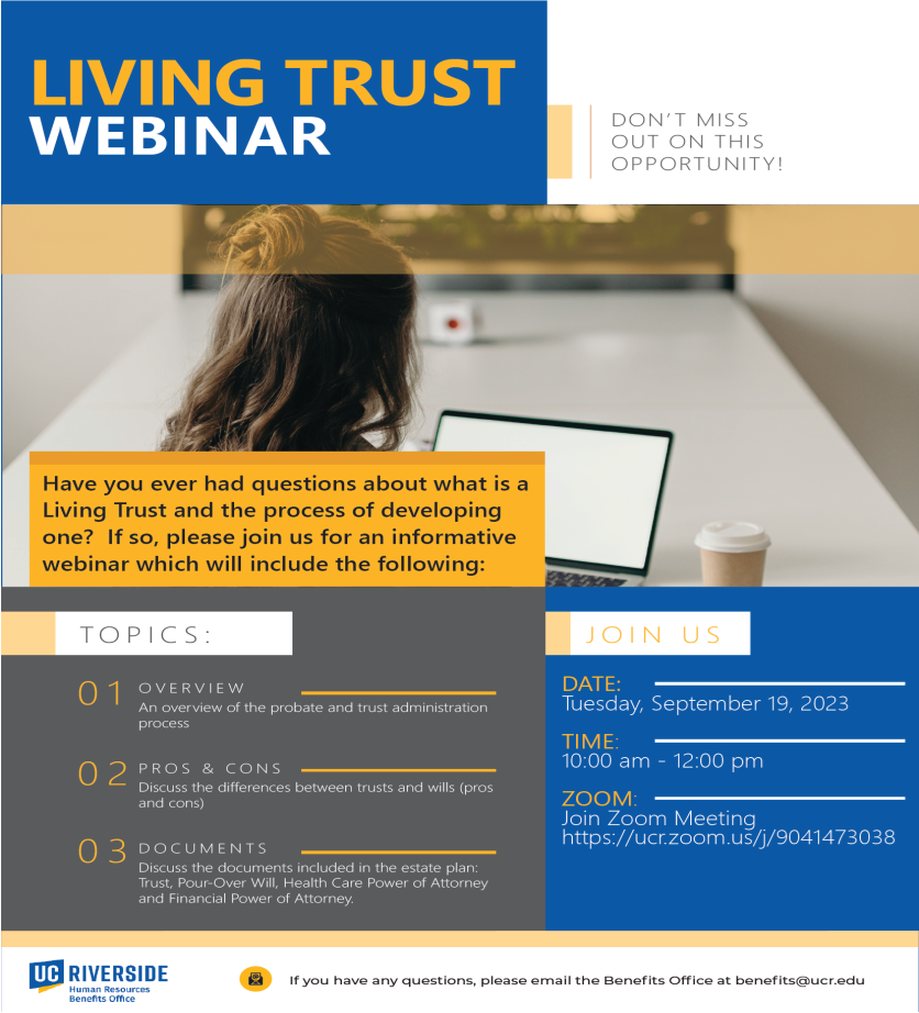 Please join us for this much anticipated webinar highlighting the benefits of and the importance of understanding how to create a living trust. Download PDF<https://hr.ucr.edu/sites/default/files/2023-07/livingtrust_9_19.pdf>.