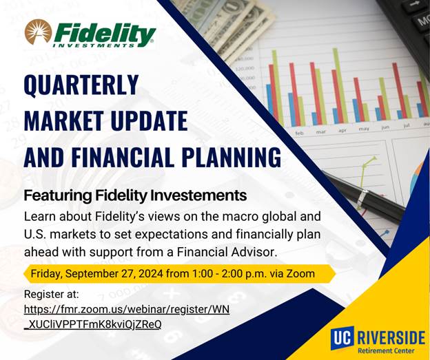 The UCR Retirement Center invites you to participate in the online presentation - Quarterly Market Update and Financial Planning presented by Fidelity Investments. In this session, faculty and staff will learn about Fidelity's views on the macro global and U.S. markets. Our Fidelity Representative will explore what drove the market in the most recent quarter, what can be expected for the future and the importance of annual financial planning.