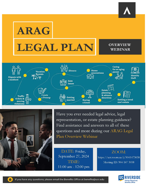 Please join us for this Overview Webinar to learn more about the legal plan benefits available to UCR Faculty and Staff. Individuals will have the opportunity to ask questions of the ARAG Legal Plan Representative during the webinar.
