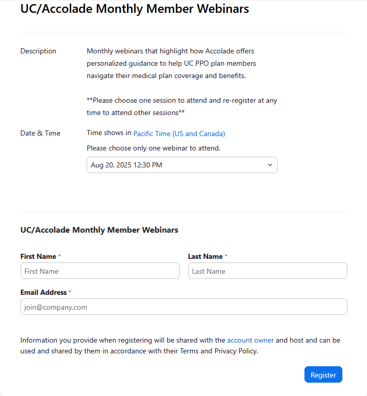 Please register for the August 20, 2025 Anthem Blue Cross Accolade Monthly Member Webinar for all UC employees across all campuses. Session begins at 12:30 PT. Please use the information below to register as sessions fill up quickly!!