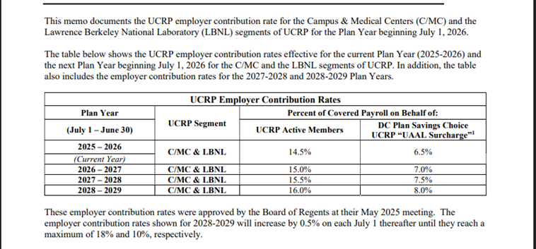 UC Office of the President announced the UC Retirement Plan employer contribution rate for the plan year beginning July 1, 2026. Please see the communication below for more details.