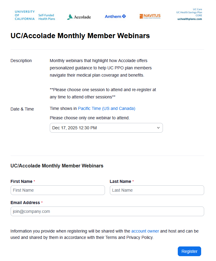 Please register for the December 17, 2025 Accolade PPO Medical Plans Monthly Member Webinar for all UC employees across all campuses. Session begins at 12:30 PT. Please use the information below to register as sessions fill up quickly!!