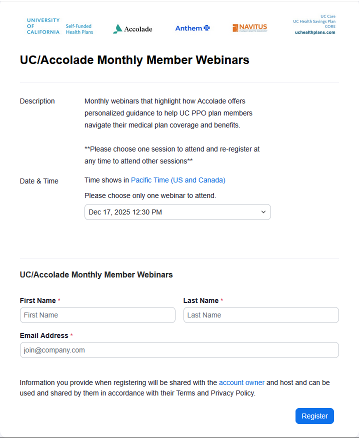 Please register for the December 17, 2025 UC PPO Medical plans Accolade Monthly Member Webinar for all UC employees across all campuses. Session begins at 12:30 PT. Please use the information below to register as sessions fill up quickly!!