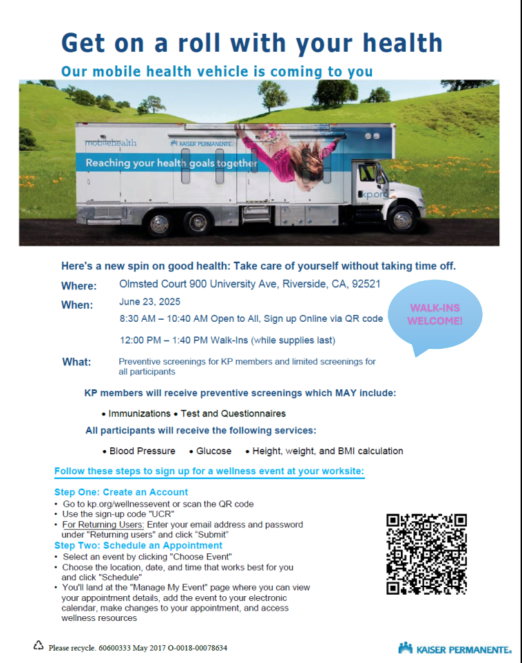 UCR is partnering with Kaiser Permanente to offer an opportunity for all Faculty and Staff to receive free blood pressure, glucose, and cholesterol screenings on the UCR campus. Please register using the link below or QR code on the flyer. This event is free for all Kaiser and Non-Kaiser members.