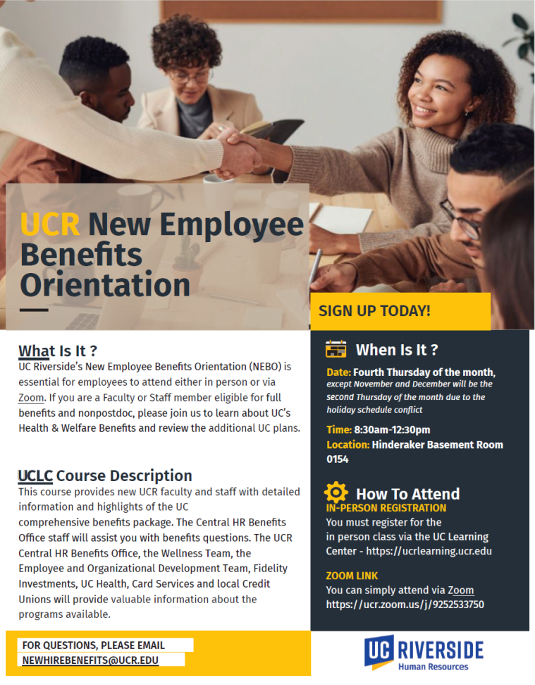 Don't miss this important opportunity to better understand your UC benefits. Please see below or view the flyers at this link for more on the UCR New Employee Benefits Orientation<https://documents.ucr.edu/HR-Benefits/benefits-nebo-ucr-new-employee-benefits-orientation-flyer.pdf> and the monthly webinar hosted by the UCPath Center at this link UCPath New Employee Benefits Orientation<https://hr.ucr.edu/sites/default/files/2024-02/ucpath_nebo_flyer_2024.pdf>.