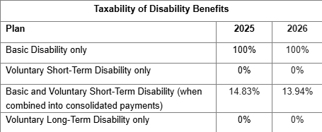 The Basic and Voluntary Short‑Term Disability (VSTD) plans provide benefits for up to six months. When an employee is enrolled in both the VSTD and Basic disability plans, benefits from both plans are usually paid concurrently, with Lincoln Financial Group issuing a single consolidated payment. Each year, LFG adheres to IRS guidelines to determine the taxable portion of disability benefits. For 2026, 13.94% of disability payments will be subject to taxes when employees receive both Basic and VSTD benefits at the same time — a reduction of 6.38% from 2025.