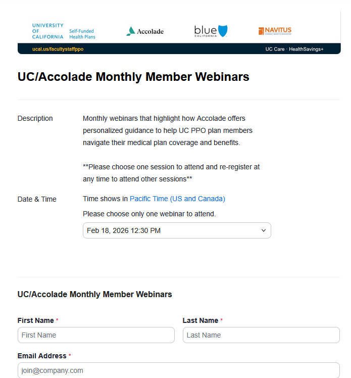Please register for the February 18, 2026 Blue Shield Accolade Monthly Member Webinar for all UC employees across all campuses. Session begins at 12:30 PT. Please use the information below to register as sessions fill up quickly!!