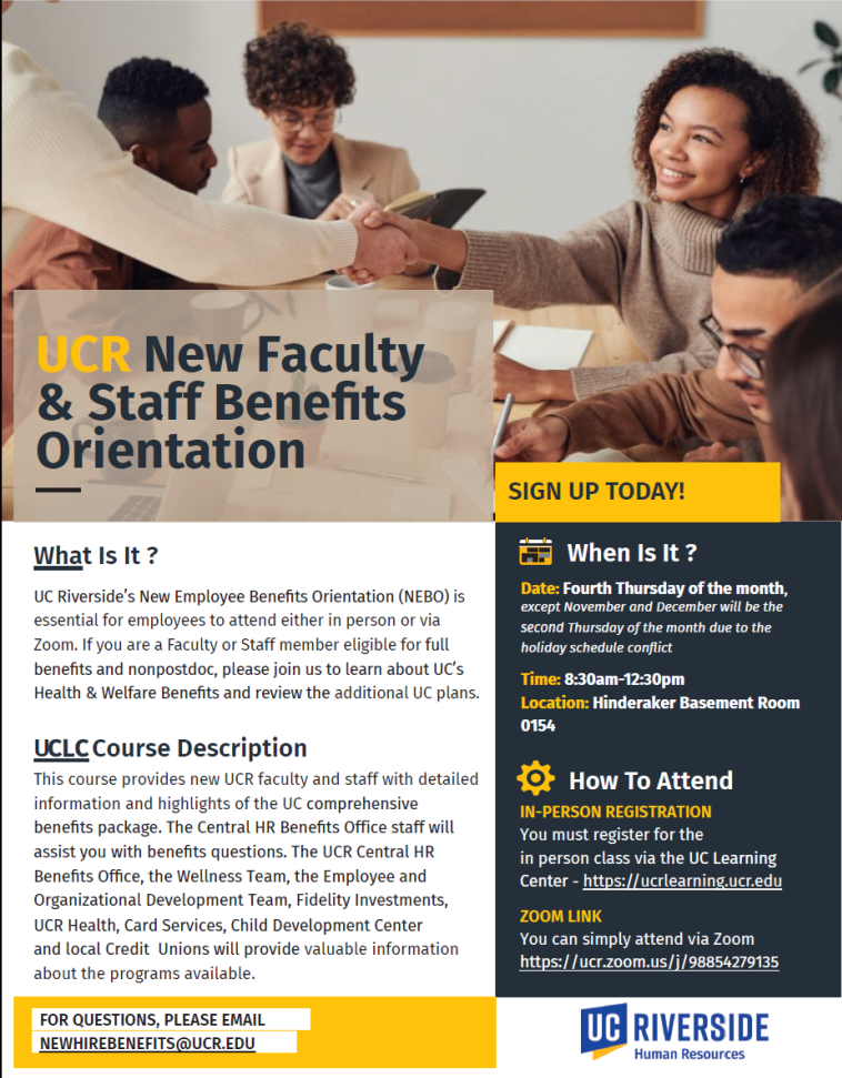 Please register for the next In-Person New Hire Employee Benefits Orientation (NEBO) session happening Thursday, March 26, 2026. Please visit the UC Learning Center (LMS)<https://ucrlearning.ucr.edu/> to reserve your space. You also have the option to join via the Zoom meeting<https://ucr.zoom.us/j/98854279135?pwd=xHd6Igc11Jo9E9Vfi1SNbgxkSBU2X1.1&jst=2> on the day of the event. No registration is required for Zoom attendance, but please log in with your full name for the attendance log.