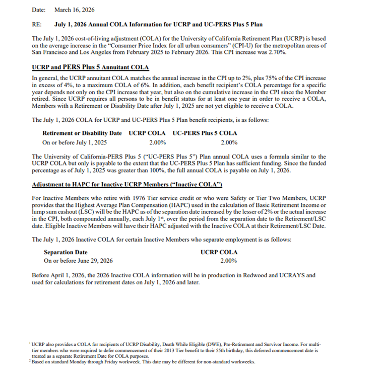 [UCRDBR] UCRP - July 1, 2026 Annual COLA Information for UCRP and UC-PERS Plus 5 Plan