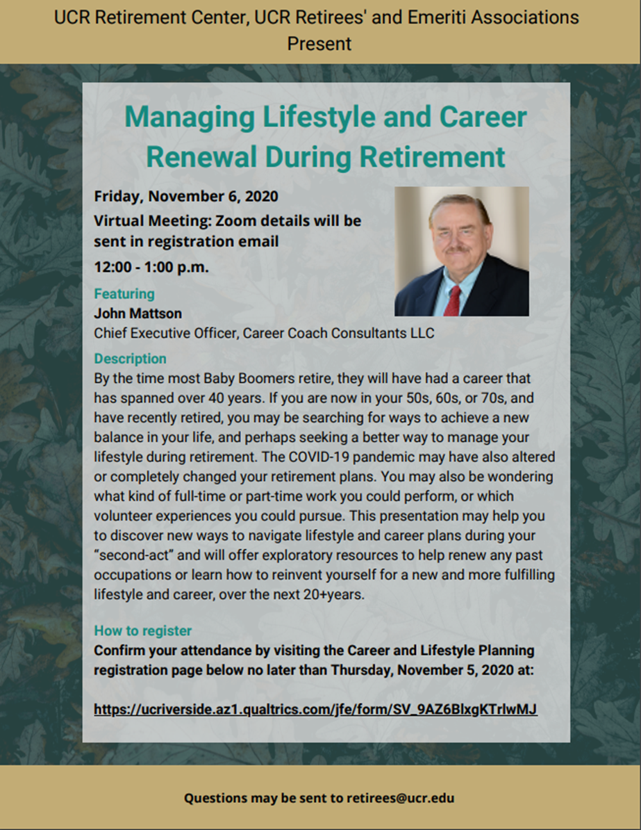 This message serves as an invitation to attend an online presentation titled, "Managing Lifestyle and Career Renewal During Retirement" presented by John Mattson, Chief Executive Officer, Career Coach Consultants LLC and on Friday, November 6, 2020 from 12:00 - 1:00 p.m. Since in-person events and gatherings are not permitted on campus at this time, we invite you to join us for this free event virtually.