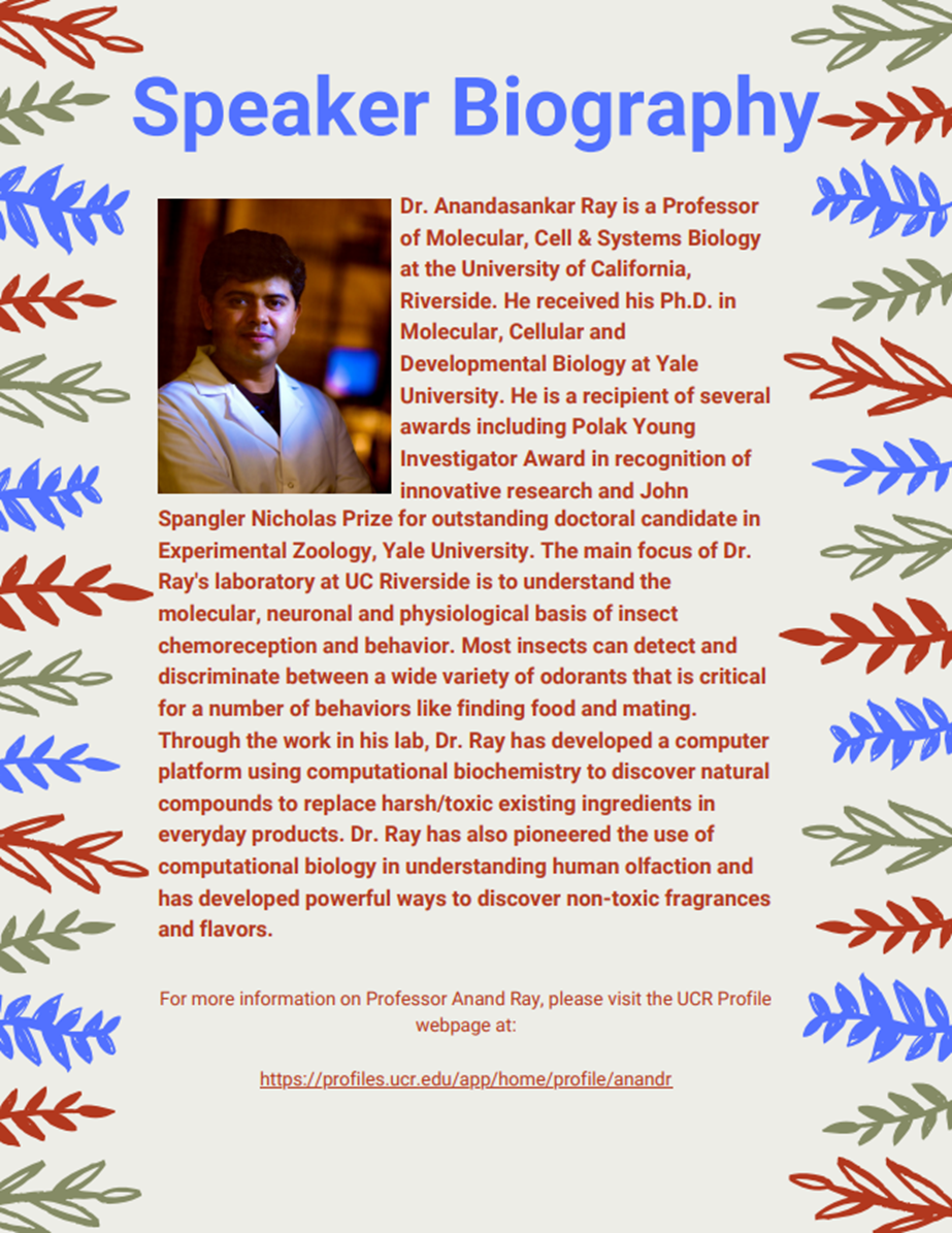 The UCR Retirees' and Emeriti Associations invites you to attend their virtual Spring Luncheon on Friday, May 14, 2021 from 11:30 a.m. - 1:00 p.m. We are excited to announce that Dr. Anand Ray, Professor of Entomology will give an online presentation titled, "Fighting Disease with Scents".