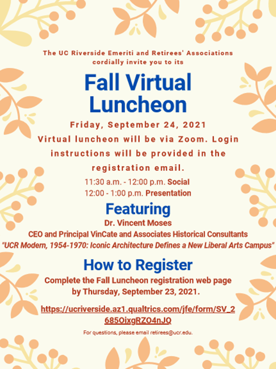 The UCR Retirees’ and Emeriti Associations invites you to attend their virtual Fall Luncheon on Friday, September 24, 2021 from 11:30 a.m. – 1:00 p.m. We are excited to announce that Dr. Vincent Moses, CEO and Principal VinCate and Associates Historical Consultants will give an online presentation titled, “UCR Modern, 1954-1970: Iconic Architecture Defines a New Liberal Arts Campus”.