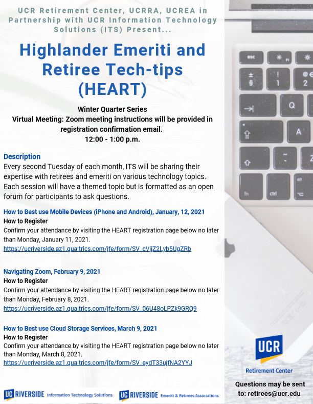Technology Tuesdays are now known as Highlander Emeriti and Retiree Tech-tips (HEART). HEART program sessions will continue to focus on purposeful tips designed to increase our technical aptitudes within our community. You are invited to join our first HEART session on - How to Best use Mobile Devices (iPhone and Android). In partnership with UCR's Information Technology Solutions (ITS), ITS representatives will be on hand to lead these sessions and provide a question and answer session for retirees and emeriti to have any technology questions answered.