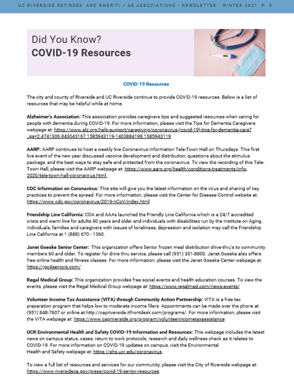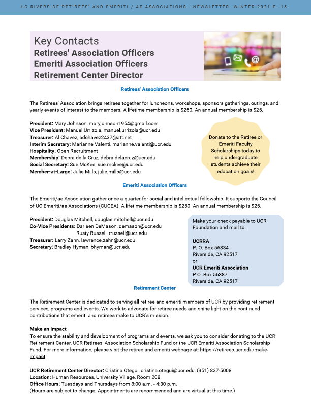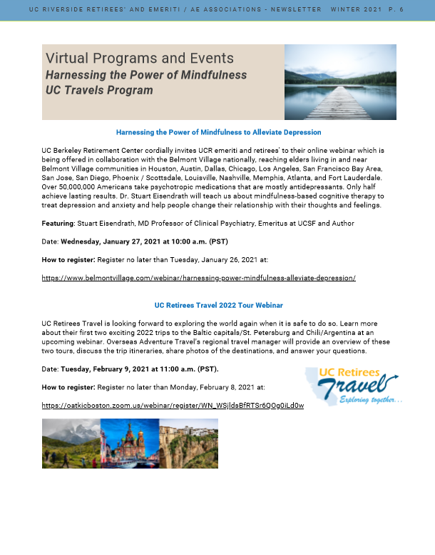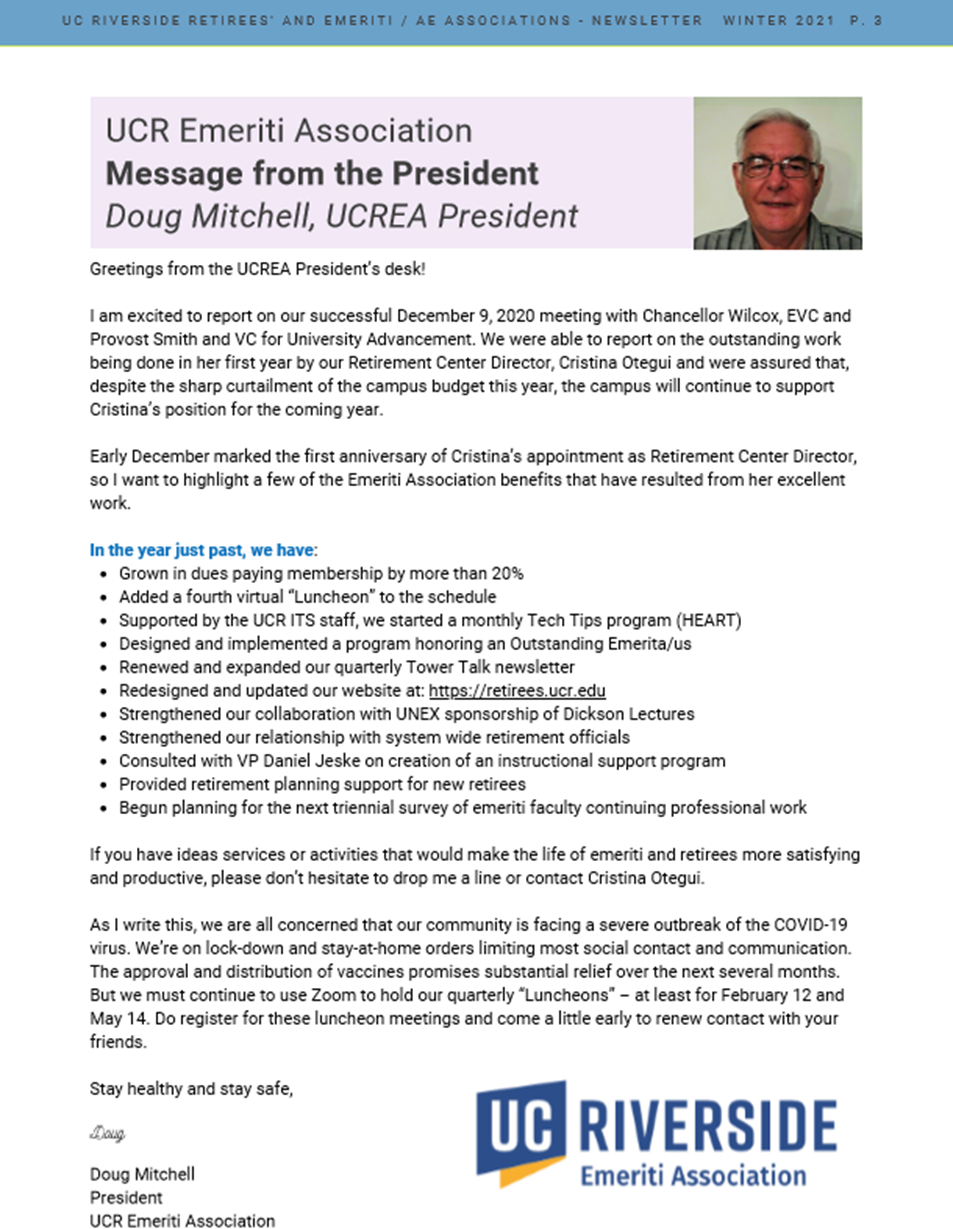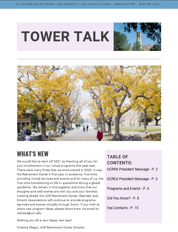 Please click on the attached document to view the UCR Emeriti and Retirees' 2021 Winter Tower Talk Newsletter. Below is a pictured view of what is included.