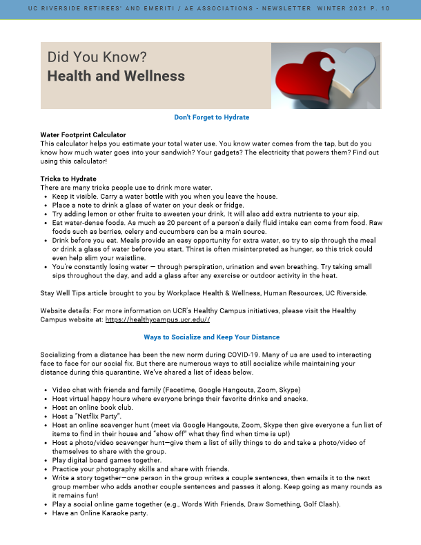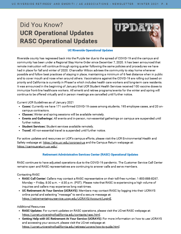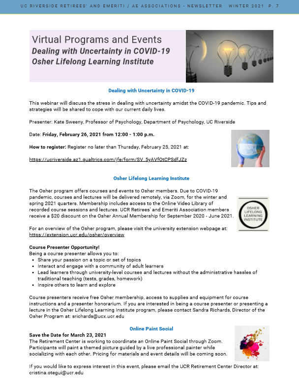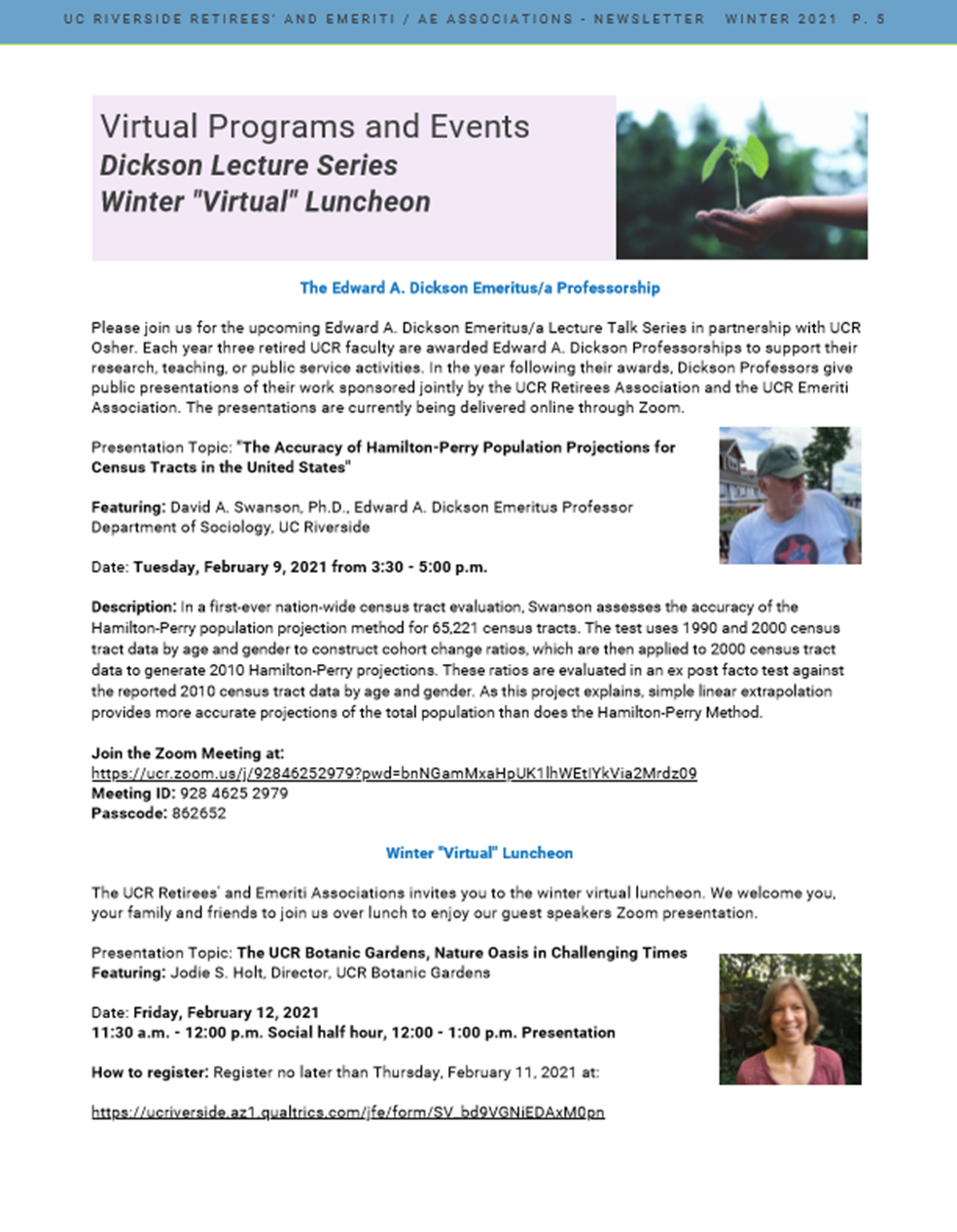 Please click on the attached document to view the UCR Emeriti and Retirees' 2021 Winter Tower Talk Newsletter. Below is a pictured view of what is included.