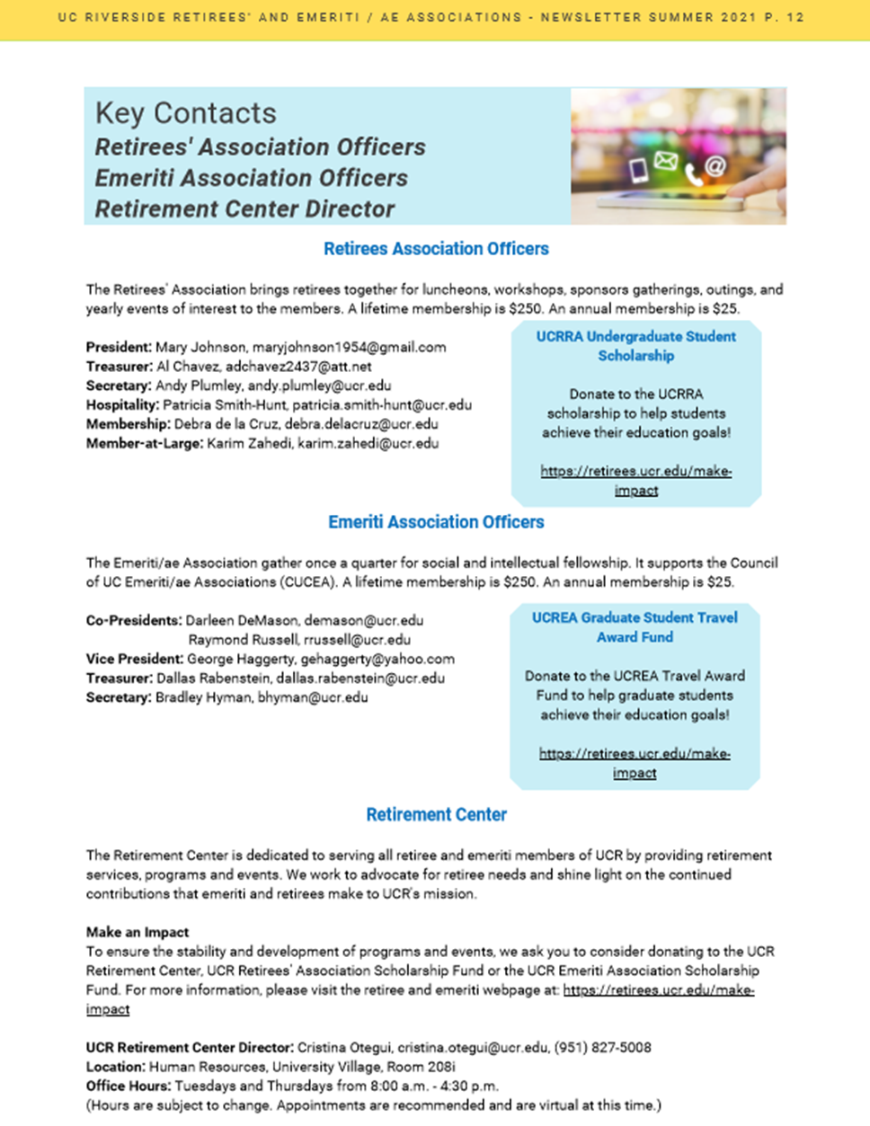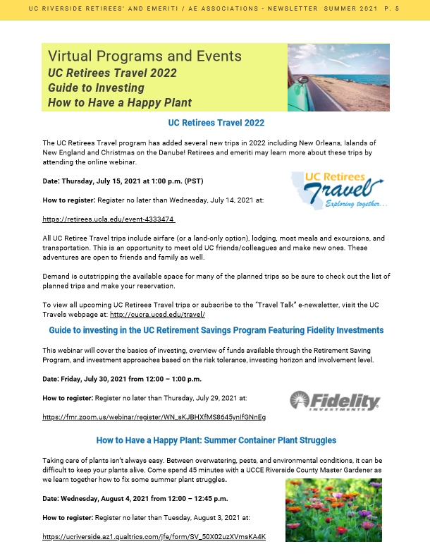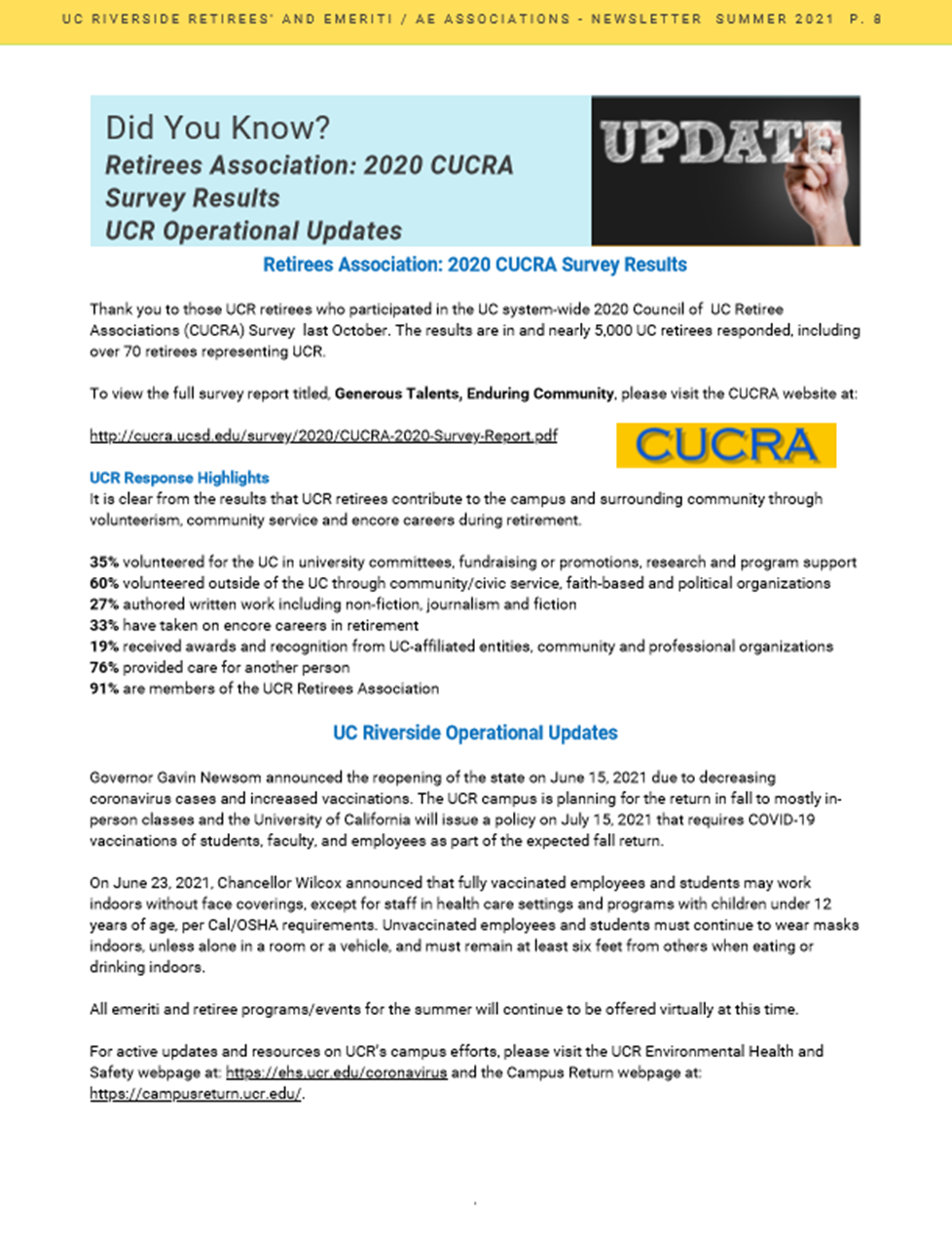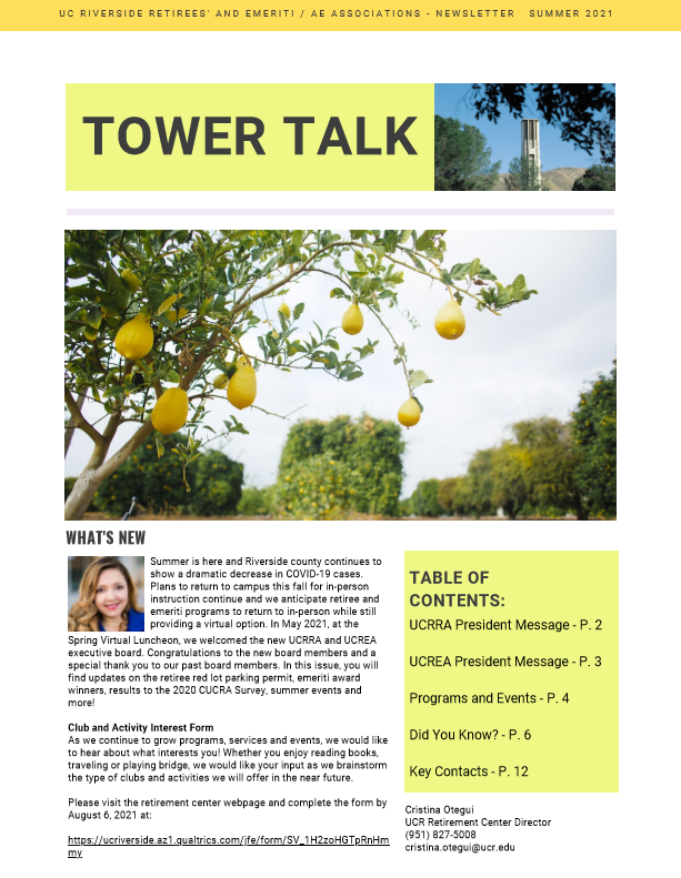 Please click on the attached document to view the UCR Emeriti and Retirees' 2021 Summer Tower Talk Newsletter. Included are clickable links to help navigate through the relevant content in the newsletter. Below is a pictured view of what is included.