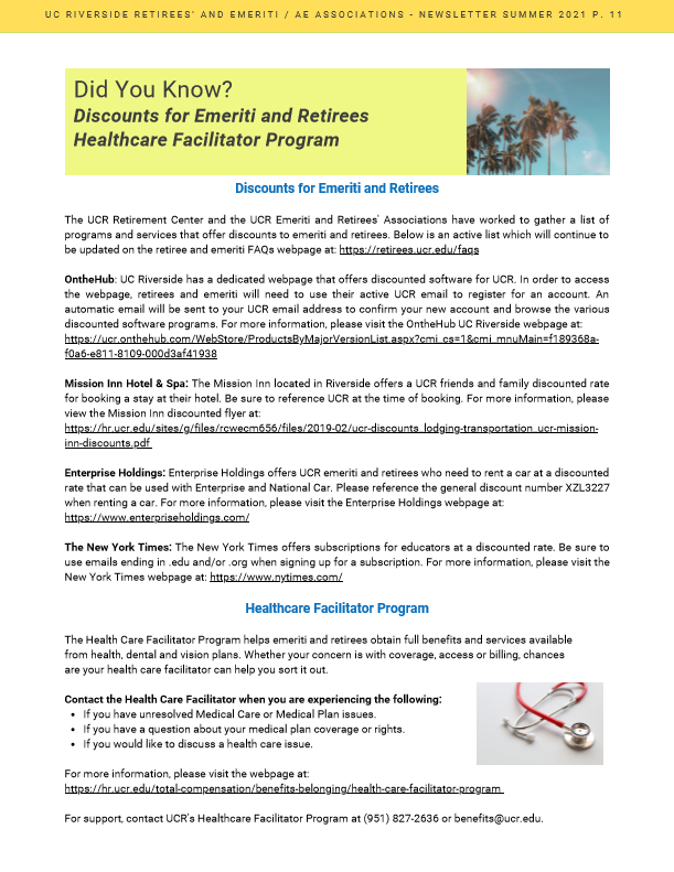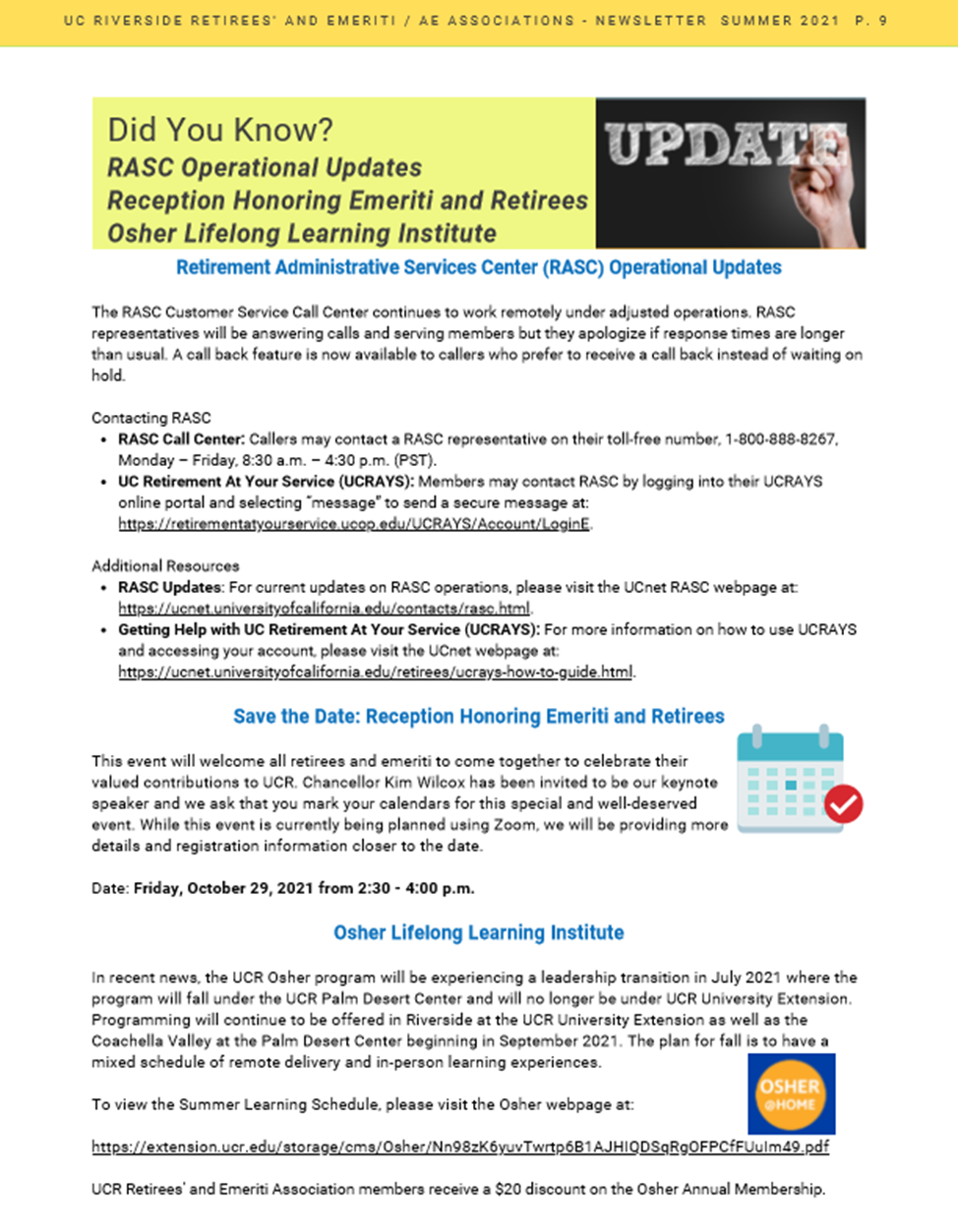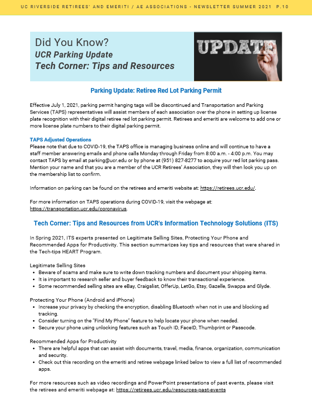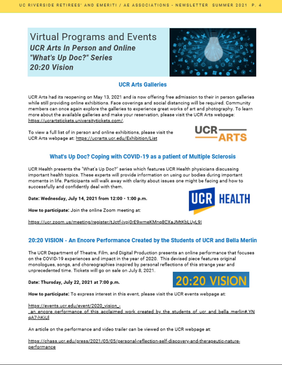 Please click on the attached document to view the UCR Emeriti and Retirees' 2021 Summer Tower Talk Newsletter. Included are clickable links to help navigate through the relevant content in the newsletter. Below is a pictured view of what is included.